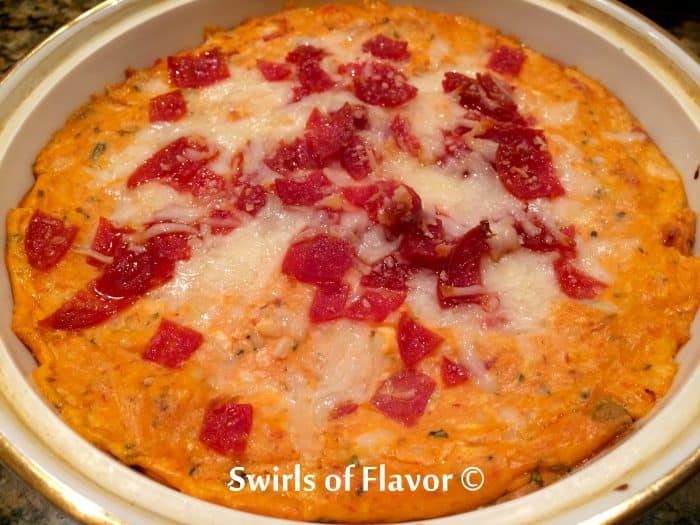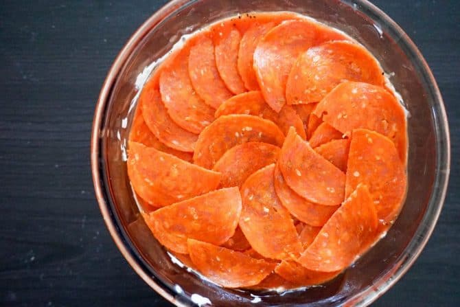 You can use a cake pan or casserole dish. Spread pizza sauce evenly over the cream cheese mixture. Spread pizza sauce evenly over the top of cream cheese mixture and top with a few pepperonis. Spread mixture into the bottom of 9 inch pie pan. Bake in preheated oven for 30 minutes or until thoroughly heated. In a large mixing bowl, with a hand mixer, whip the cream cheese until nice and fluffy, about 1 minute. Transfer the mixture to the prepared baking dish and spread out evenly. Mix together remaining onions and all other ingredients.